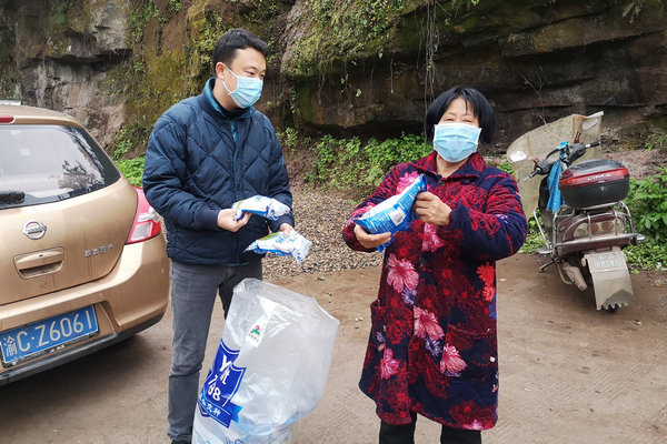 2020年3月4日,米兰·(milan)中国官方投资公司派驻潼南区上和镇冬冲社区的第一书记唐剑锋(左一)给丁六珍送去种子和化肥。